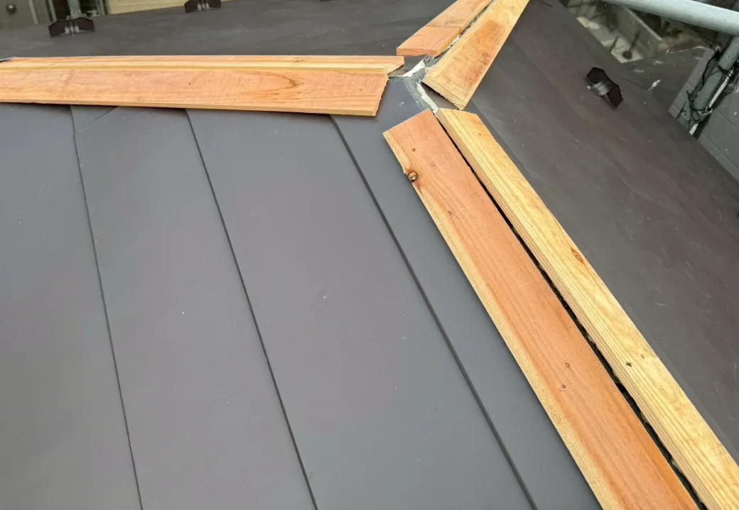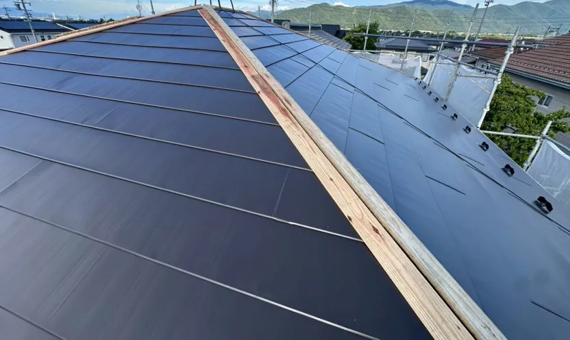 雨が入りやすい屋根の端をしっかり覆うため、専用の板金部材(役物)を取り付けて、防水性と仕上がりを整えます。
